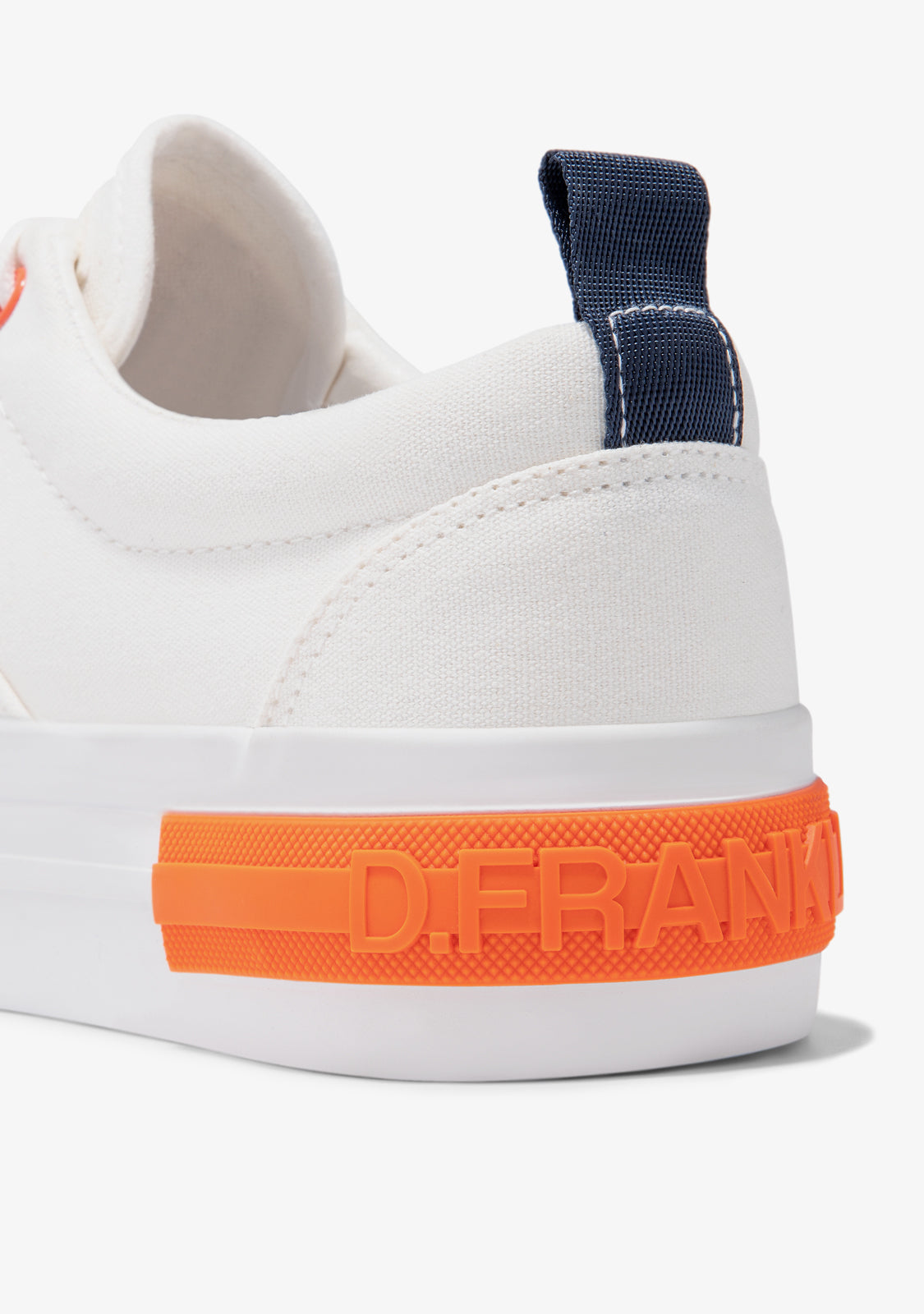 O nosso design branco One Way é construído em tecido de lona. Sola de borracha branca, colarinho almofadado e lettering laranja personalizado no calcanhar. Com uma altura de 4 cm e o nosso emblema da bandeira na lateral.