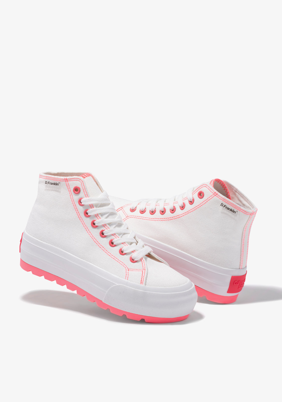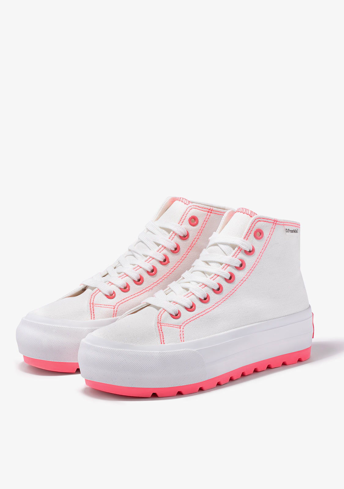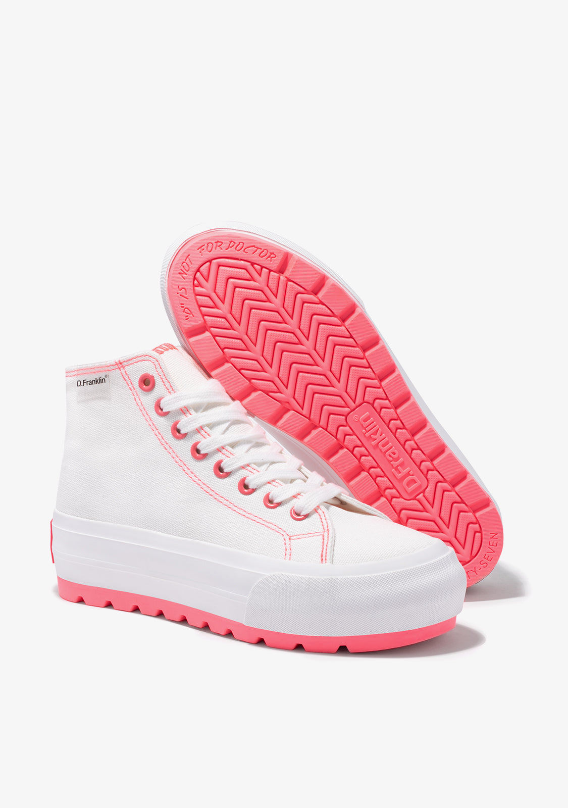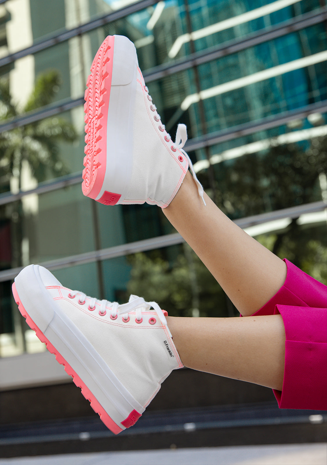 Caminhos diferentes para descobrir. Maneiras diferentes de o fazer. Inspirado no clássico One Way tênis de cano alto com um toque de rosa. Construído com sola leve branca de 5cm de aderência extra. Logotipo branco em relevo sobre fundo rosa no calcanhar.