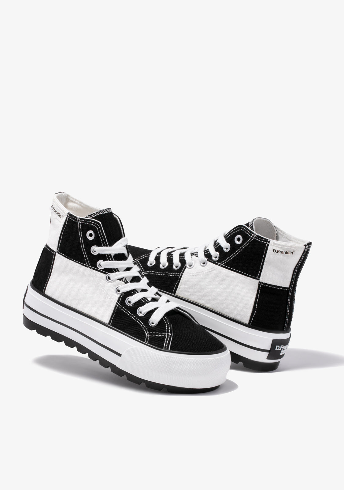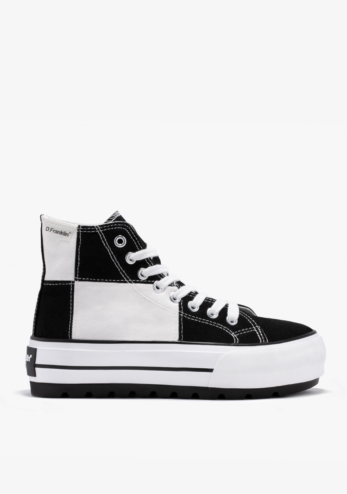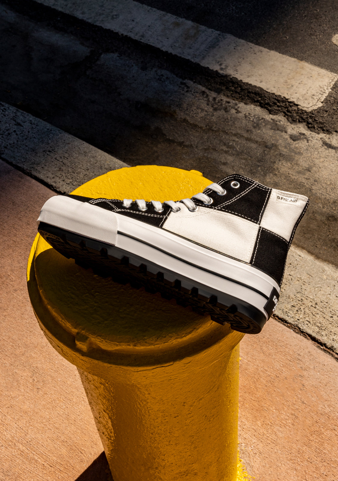 Uma abordagem retro do clássico One Way de cano alto. Projetado num padrão de xadrez preto e branco. Construído com uma sola leve branca de 5cm de aderência extra. Logotipo preto em relevo no calcanhar. Cadarços de algodão brancos.