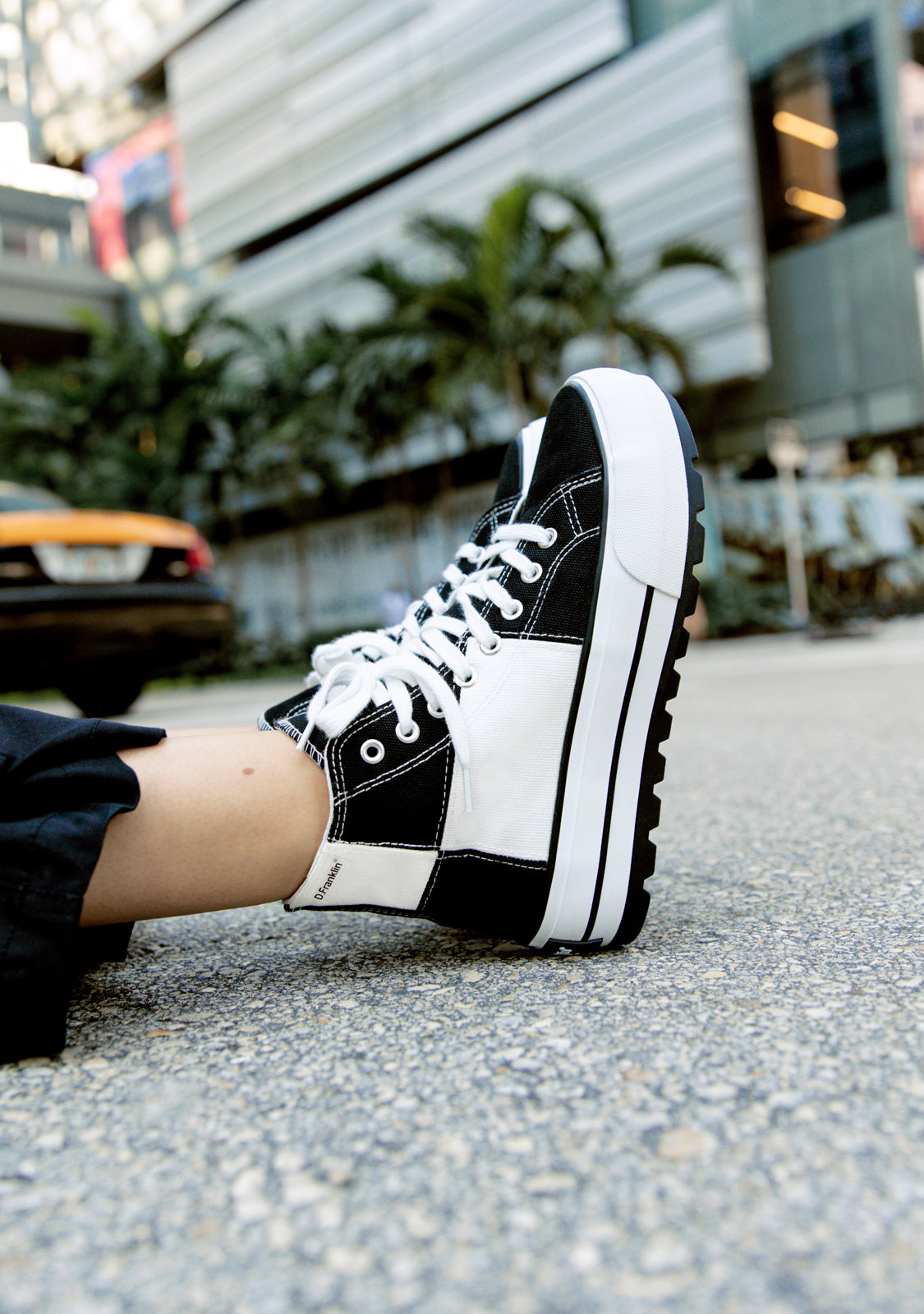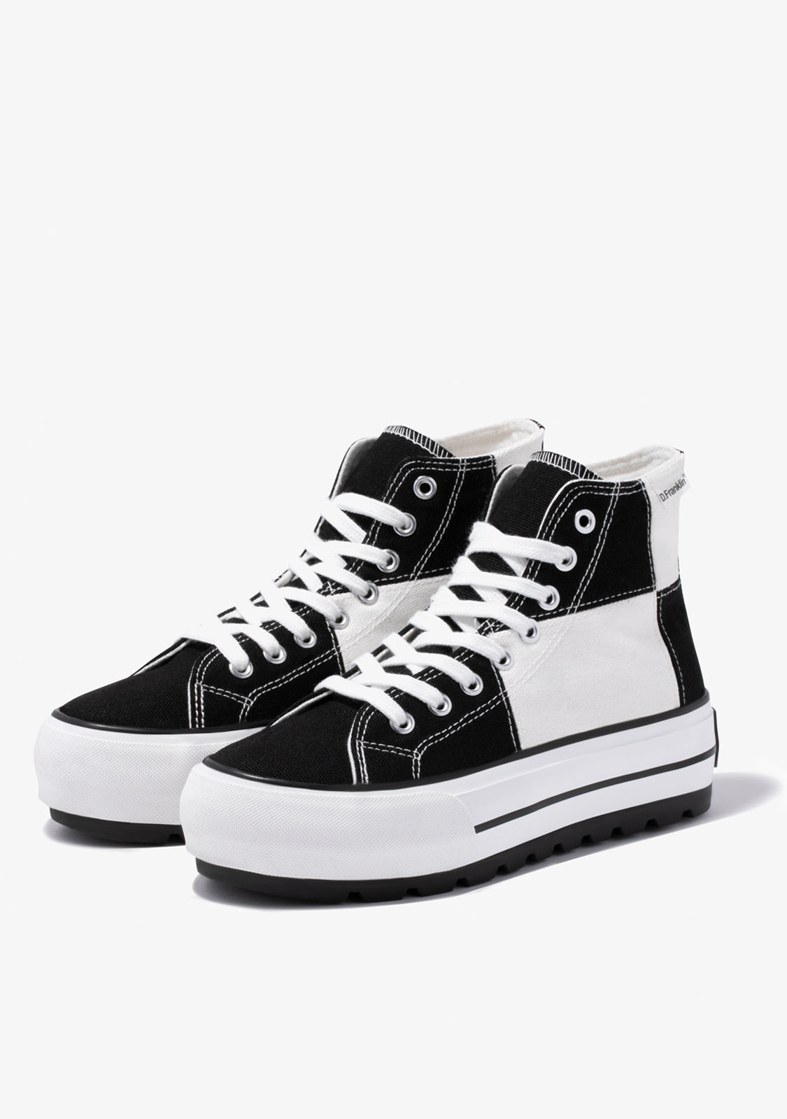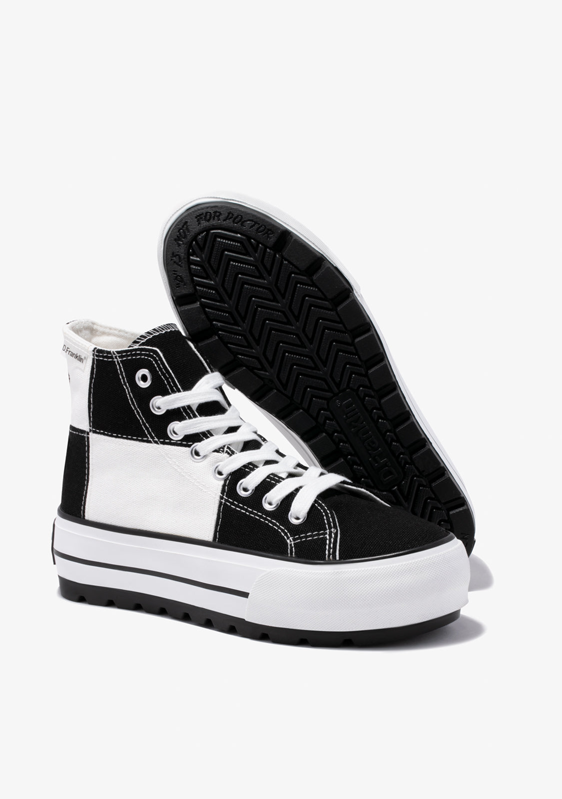 Uma abordagem retro do clássico One Way de cano alto. Projetado num padrão de xadrez preto e branco. Construído com uma sola leve branca de 5cm de aderência extra. Logotipo preto em relevo no calcanhar. Cadarços de algodão brancos.