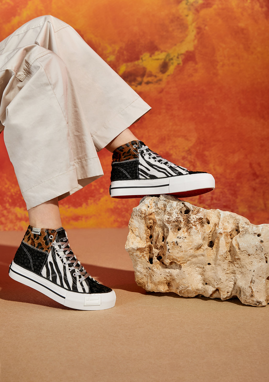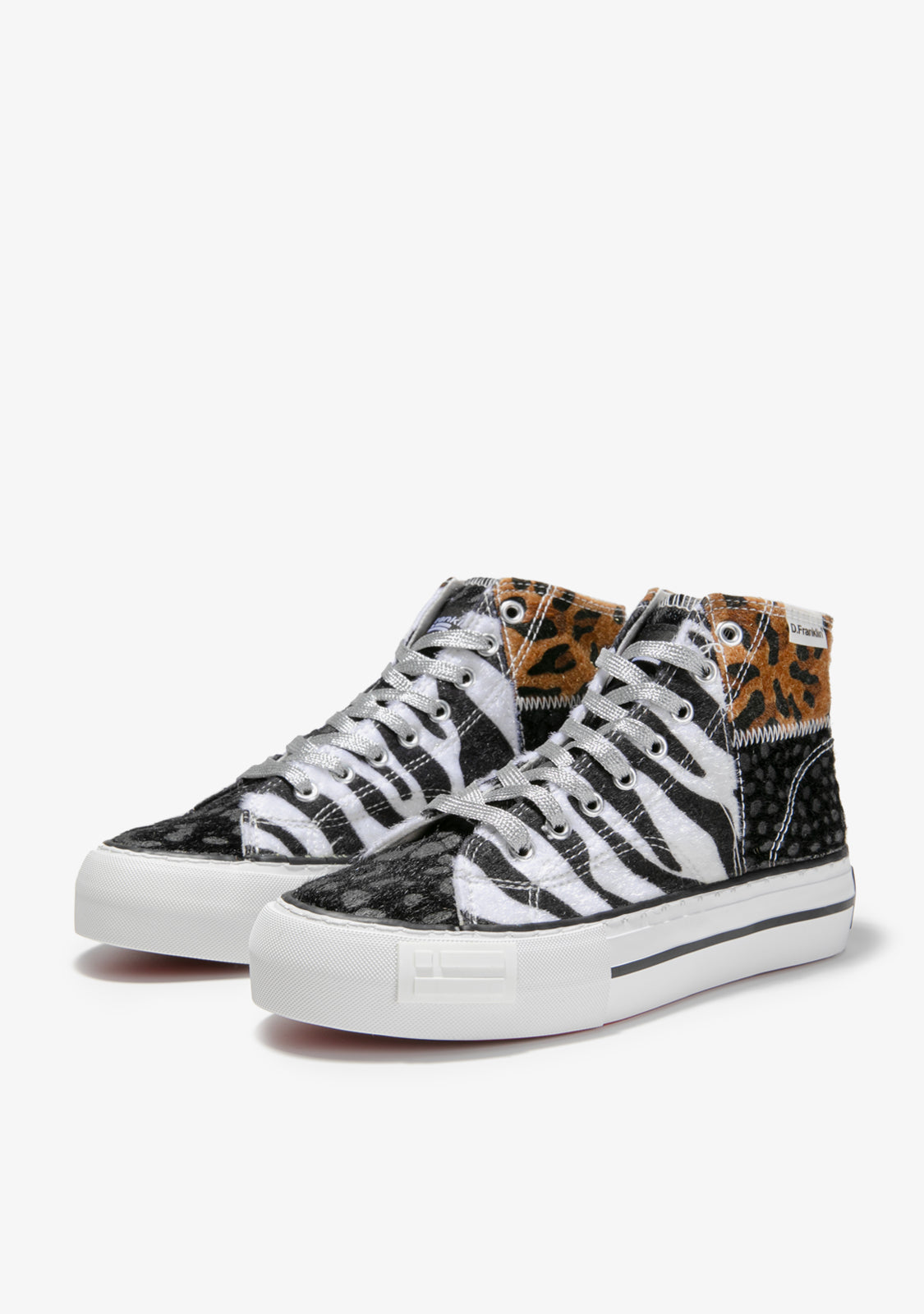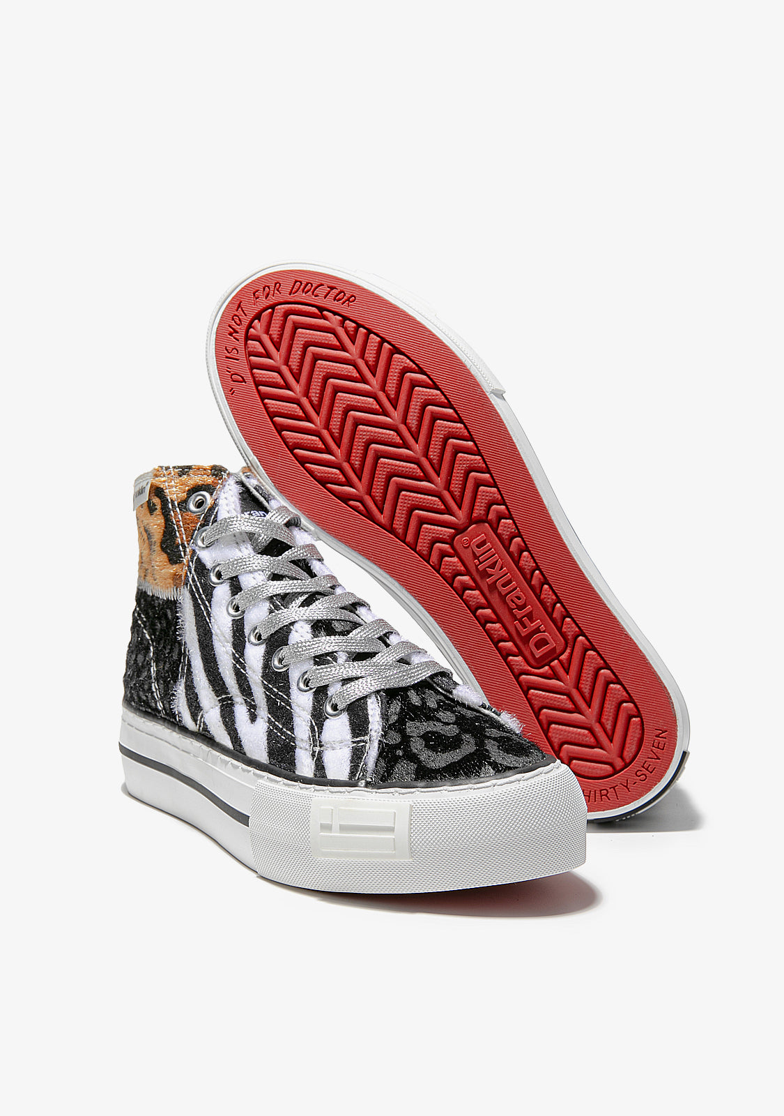 Este modelo é construído em couro sintético com uma combinação de padrão animal. Os padrões de zebra e leopardo compõem este design de bota de tornozelo. Sola de borracha branca monocromática de 4cm com emblema D.Franklin na lateral e lettering no calcanhar. Palmilha em EVA termoformada injectada.
