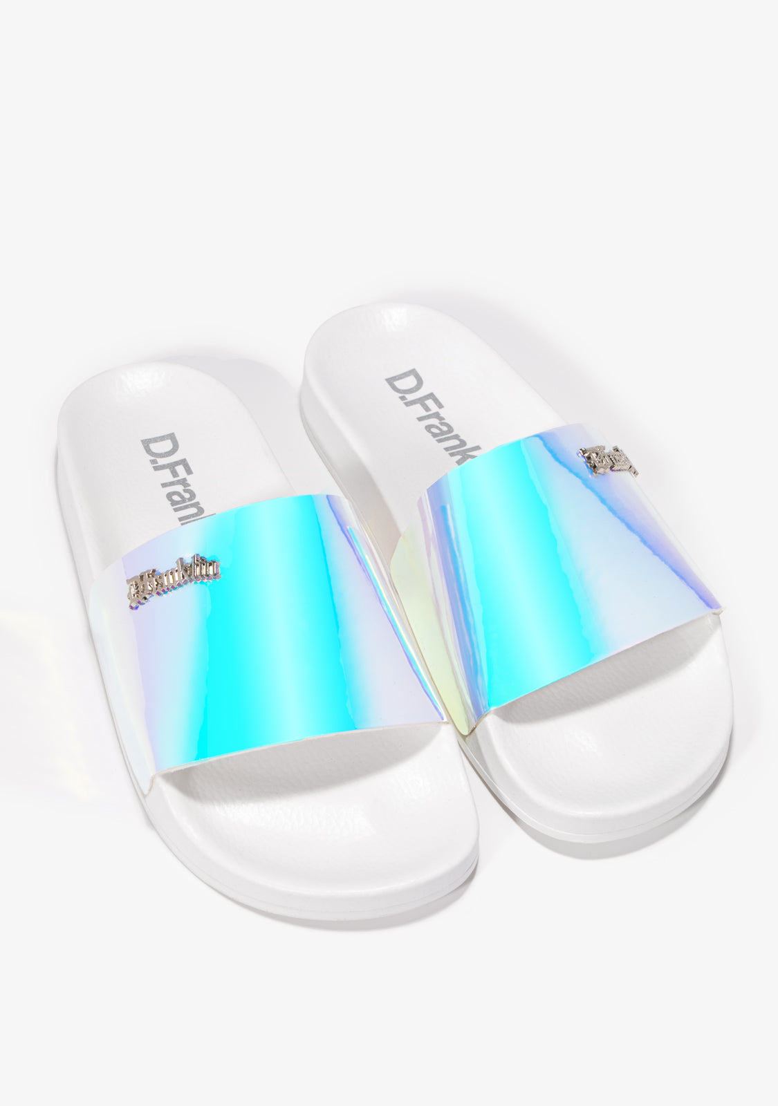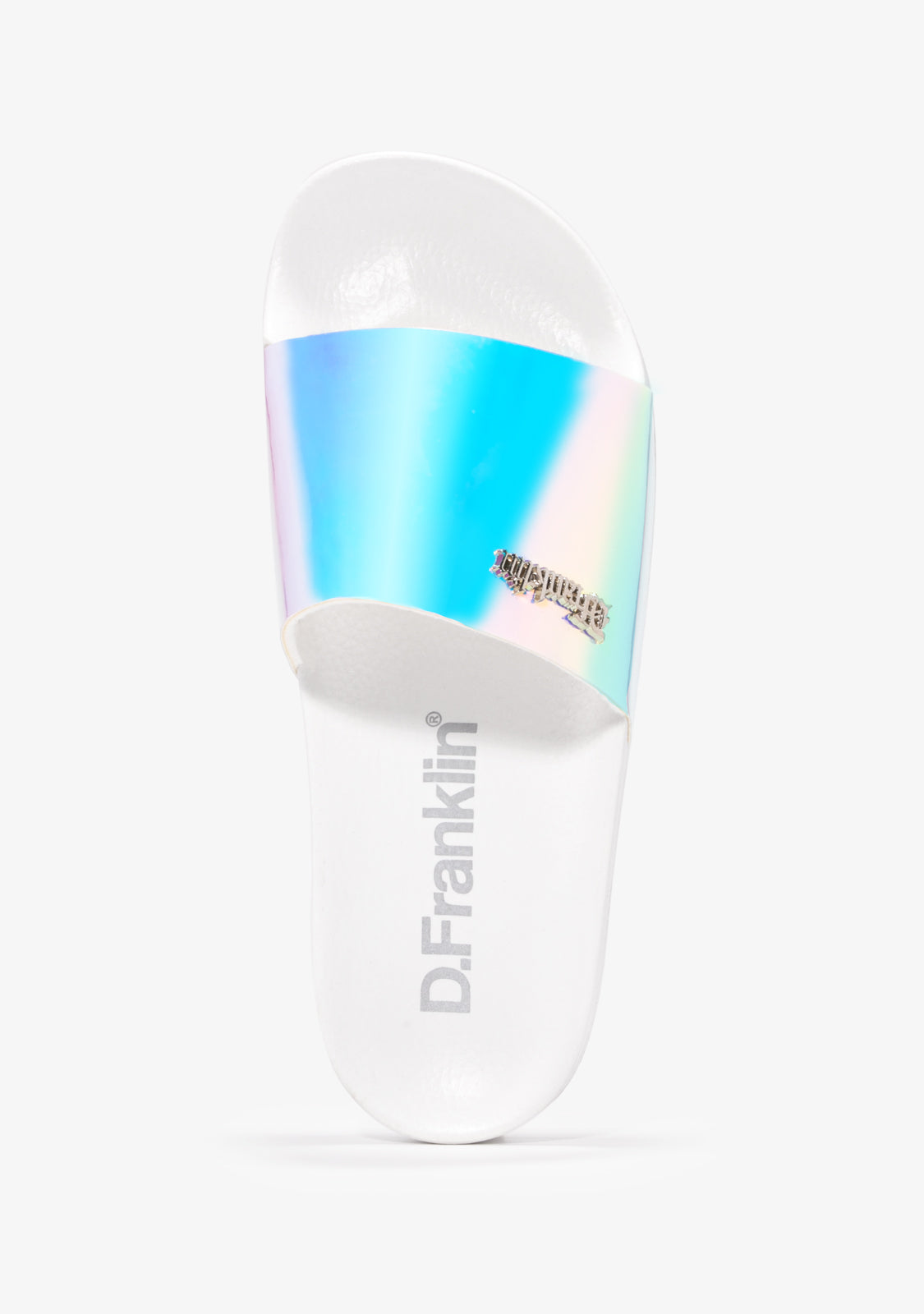 As sandálias D.Franklin Pala Slide Patent apresentam uma tira sintética larga com um efeito íris que garante suporte. Elas também apresentam o nosso emblema D.Franklin na parte superior. O design da sola é moldado para se ajustar perfeitamente à forma do pé.