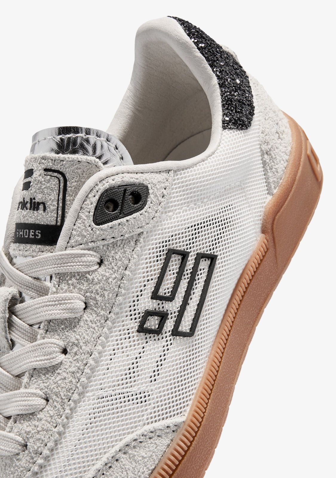 Rebel Mesh White / Black Glitter mostra personalidade desde o primeiro passo. Uma base branca e impecável, combinada com glitter preto e detalhes cintilantes, eleva qualquer look. A mistura de malha respirável e apontamentos em glitter preto cria um acabamento ousado e de alto contraste.