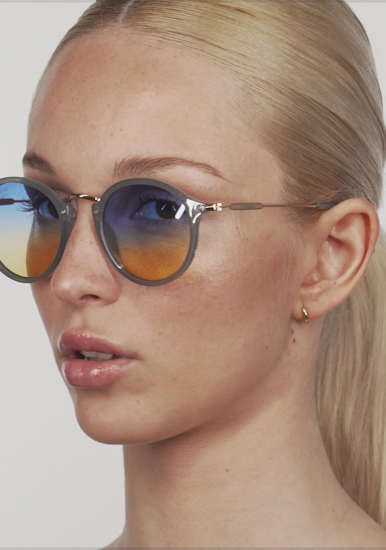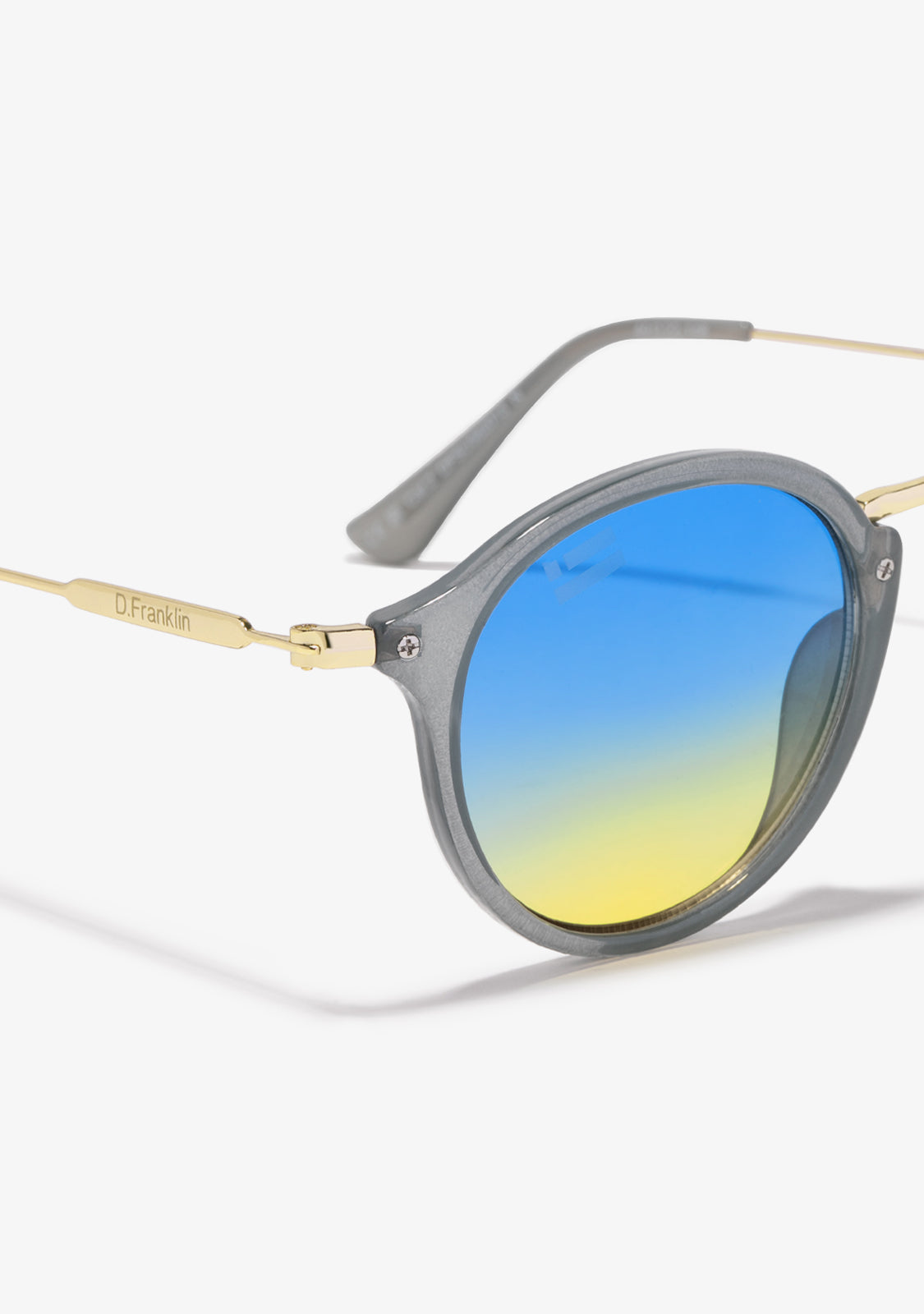Lentes azuis arredondadas e tons de armação combinados reforçam o look setentista deste modelo. Apresenta os nossos detalhes característicos D.Franklin: o logótipo gravado em ambas as hastes de metal e o nosso emblema na lente direita. Com uma largura de lente de 49mm e uma armação frontal de 148mm, estes óculos adequam-se à maioria dos rostos. As hastes laterais têm 145mm de comprimento.