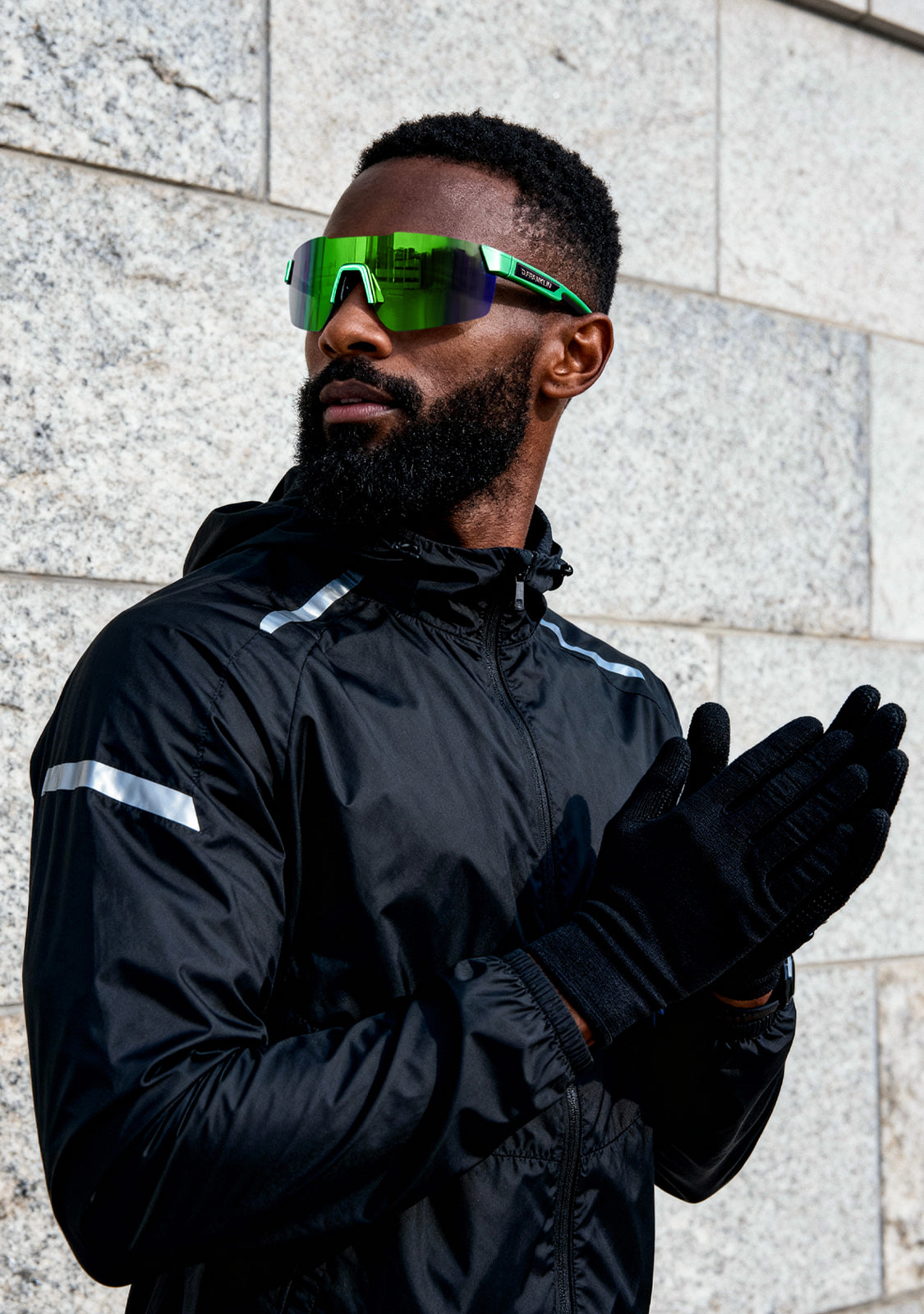 Este modelo mergulha nas profundezas dos oceanos com lentes espelhadas sem limites nem armação. Apresenta um acabamento verde e o nosso emblema característico nas laterais das hastes. A largura uniforme das lentes é de 145 mm e o comprimento das hastes é de 130 mm.