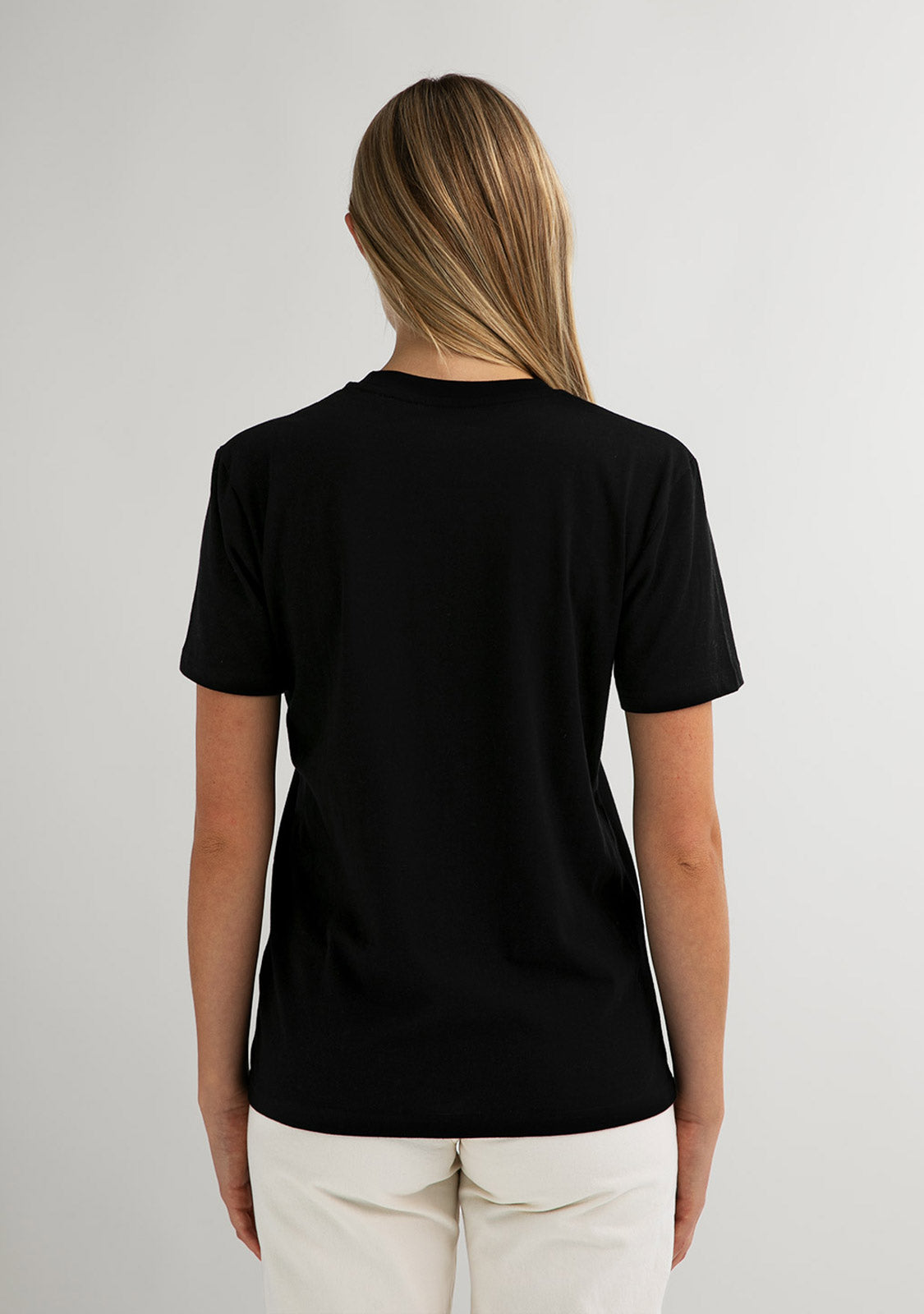 T-shirt preta de manga curta com contorno do logótipo D.Franklin em branco. Frente com inspiração em universidades e fraternidades americanas. Decote redondo com costura dupla. Feita de 100% algodão orgânico. Modelo feminino.