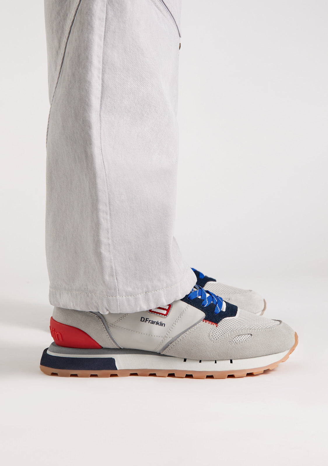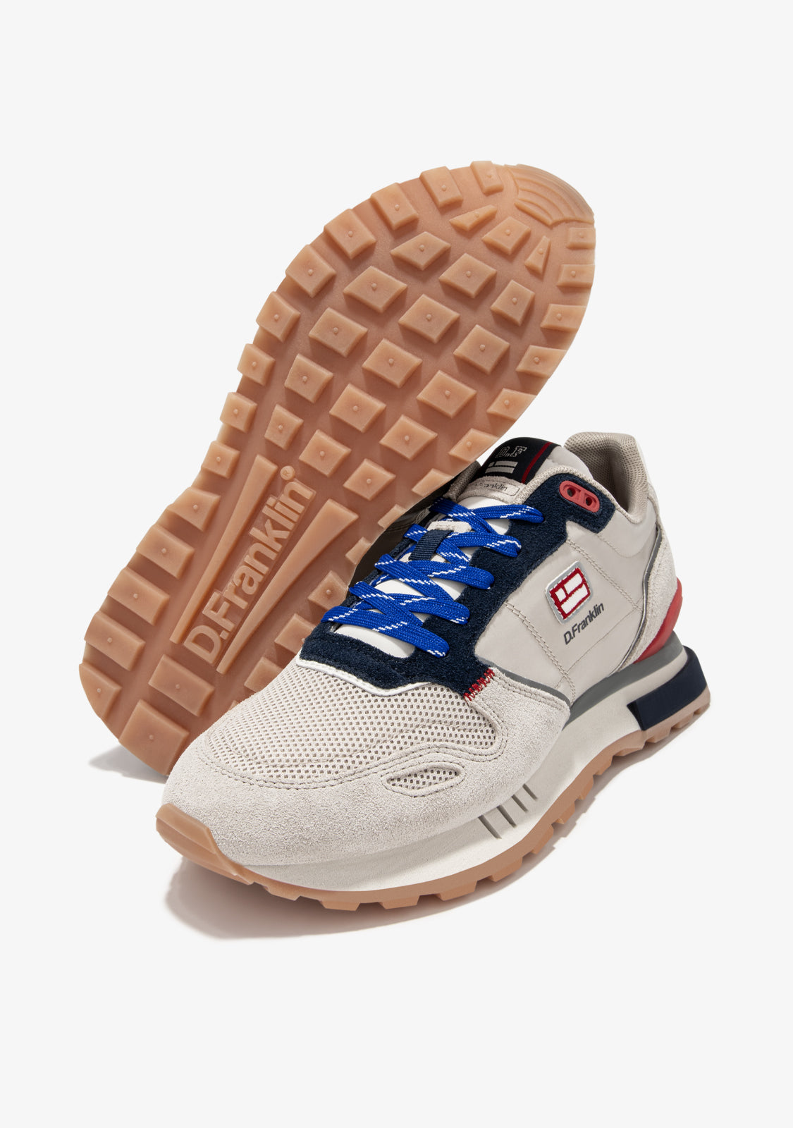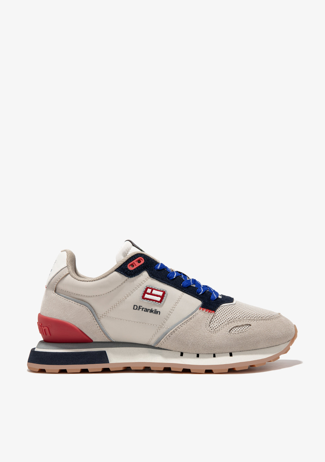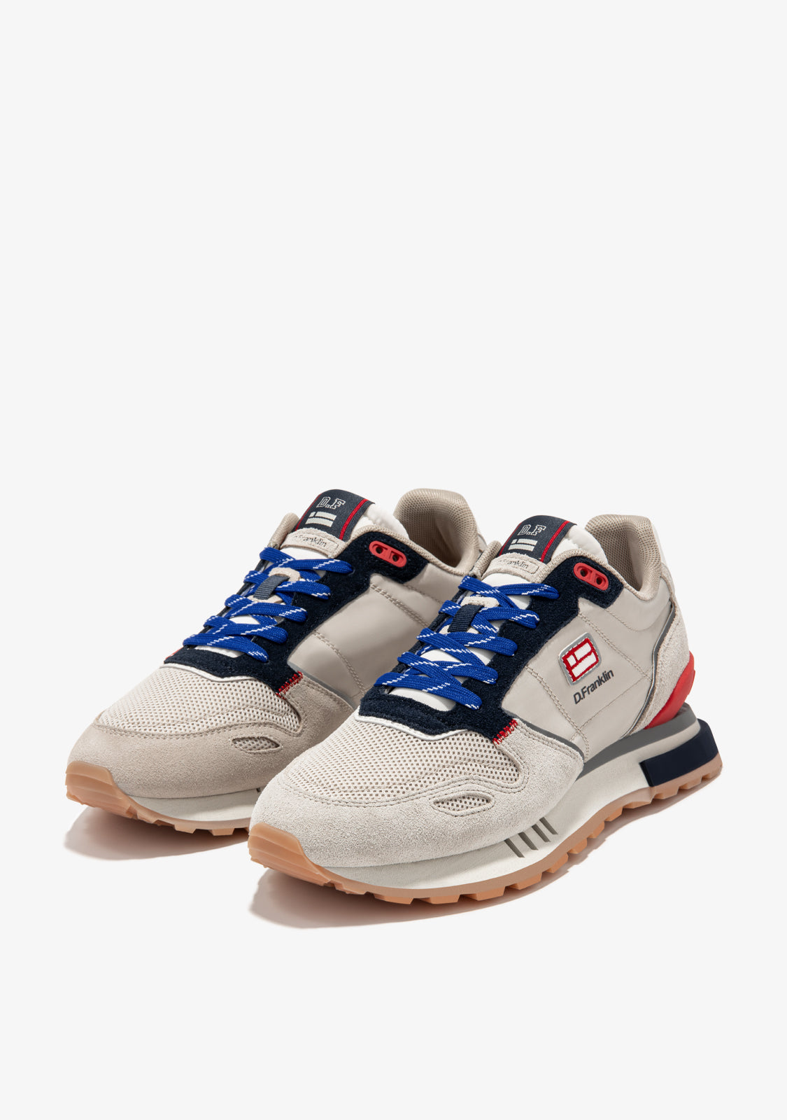Estes ténis são feitos com detalhes em cinza, azul-marinho e vermelho. Também apresentam atacadores azuis impressos. Têm uma sola TR e uma sola em pirâmide para maior conforto e tração. A área do dedo tem uma peça de dedo misto para maior flexibilidade. O nosso emblema pode ser encontrado na frente e na lateral, bem como na parte de trás.