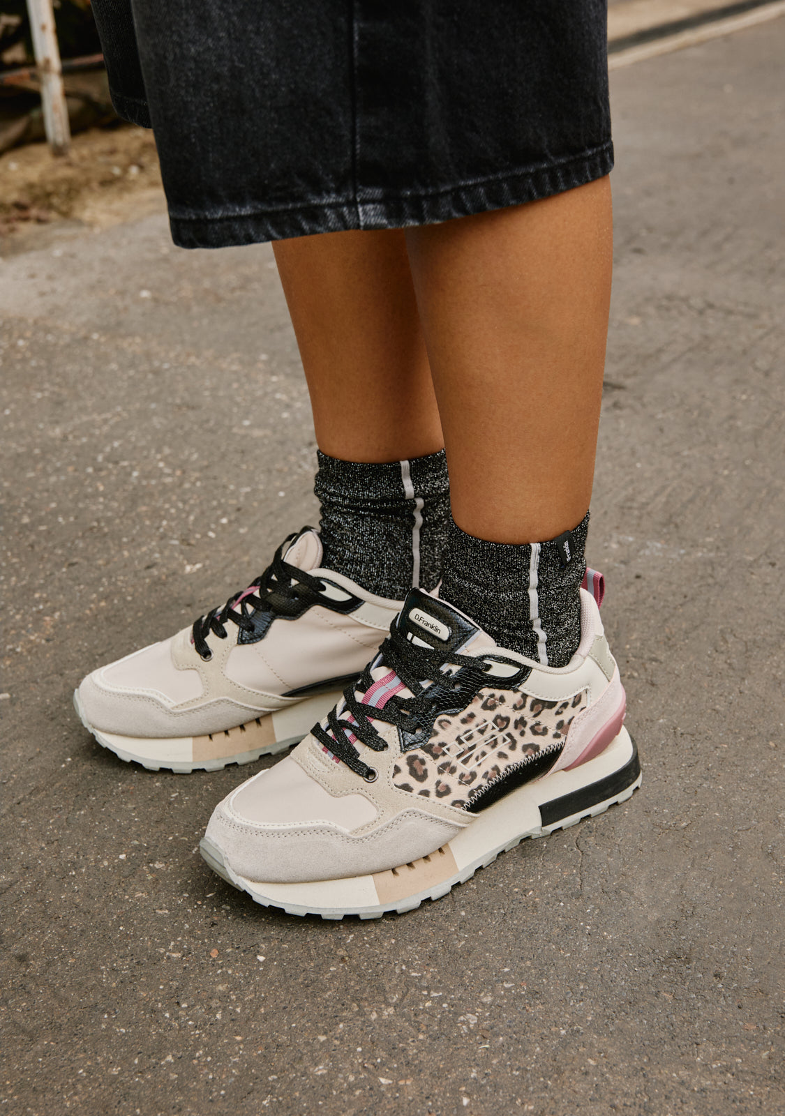 Estes sneakers são feitos com detalhes em branco, bege e rosa. Também apresentam estampa de leopardo nas laterais. Têm uma sola TR e acabamento em pirâmide para maior conforto e tração. A parte do dedo tem uma peça mista que proporciona maior flexibilidade. O nosso emblema pode ser encontrado na parte da frente e laterais, bem como na parte de trás.