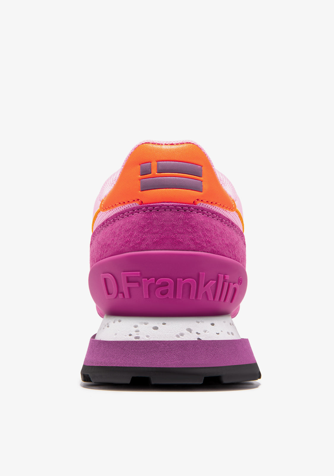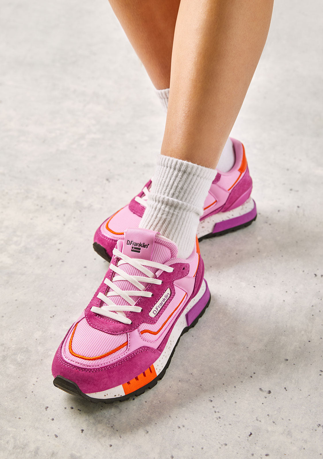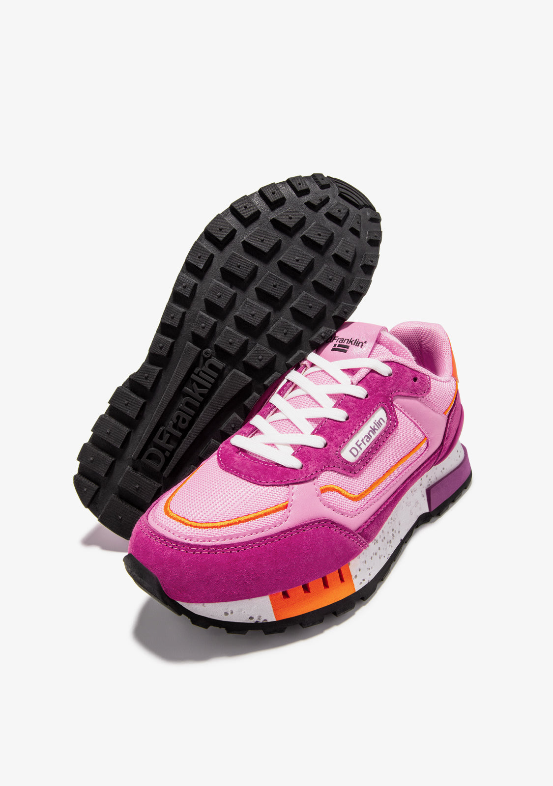 Estes ténis são confeccionados com detalhes em fúcsia e laranja. Apresentam uma sola TR com detalhes perfurados e um acabamento em pirâmide para maior conforto e tração. Também possuem uma peça de biqueira mista para maior flexibilidade. O nosso emblema pode ser encontrado na parte da frente e nas laterais, assim como na parte de trás.