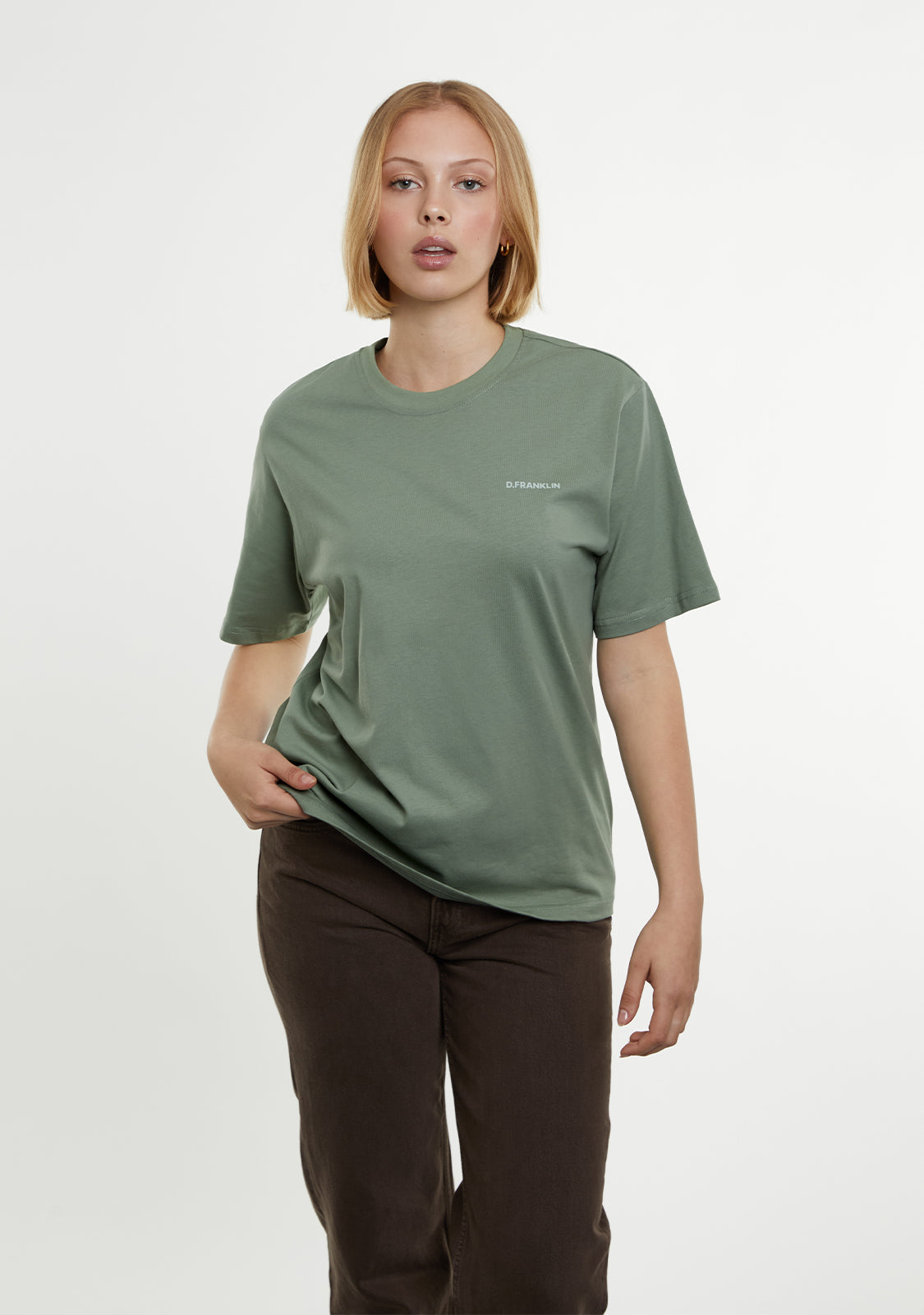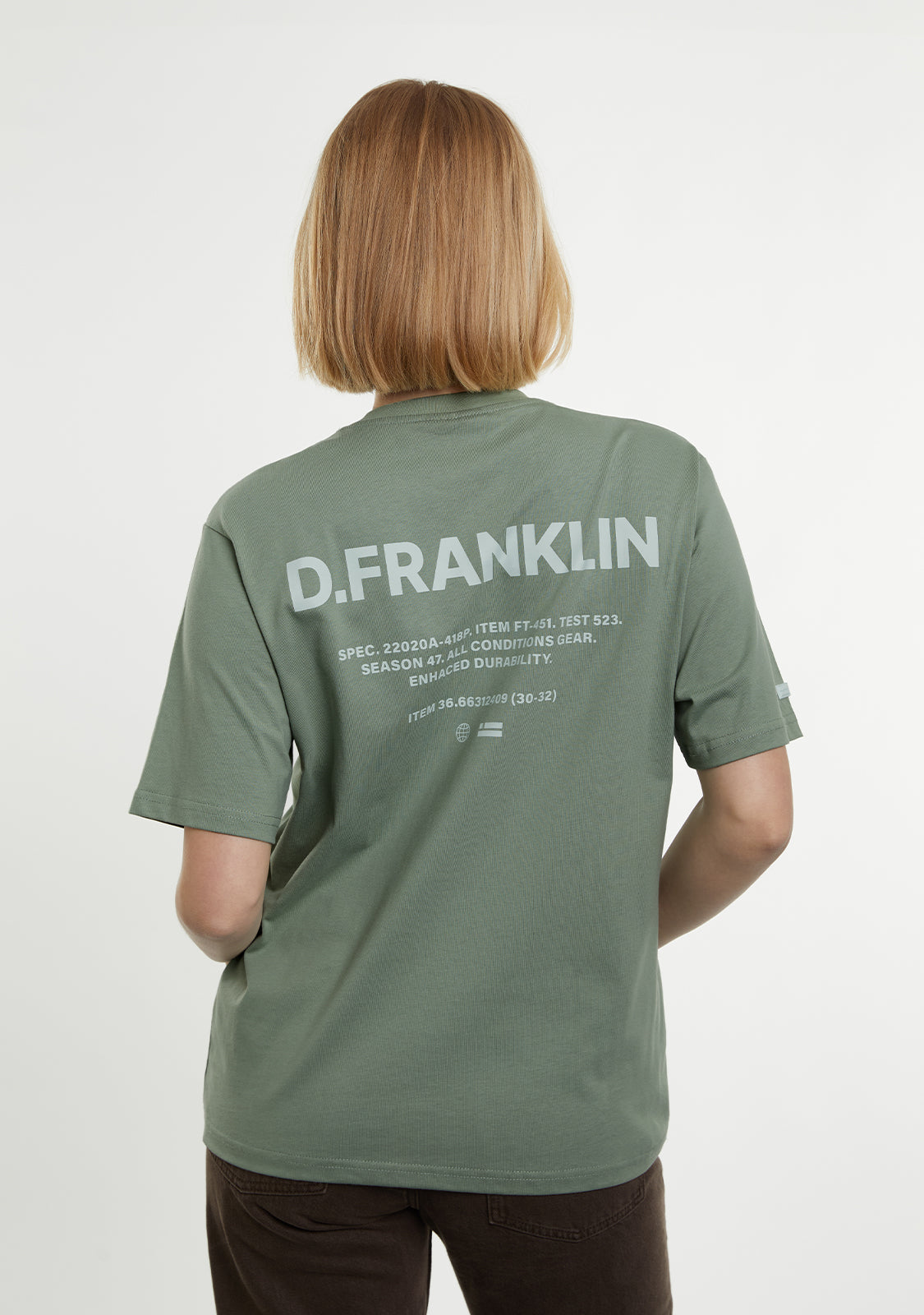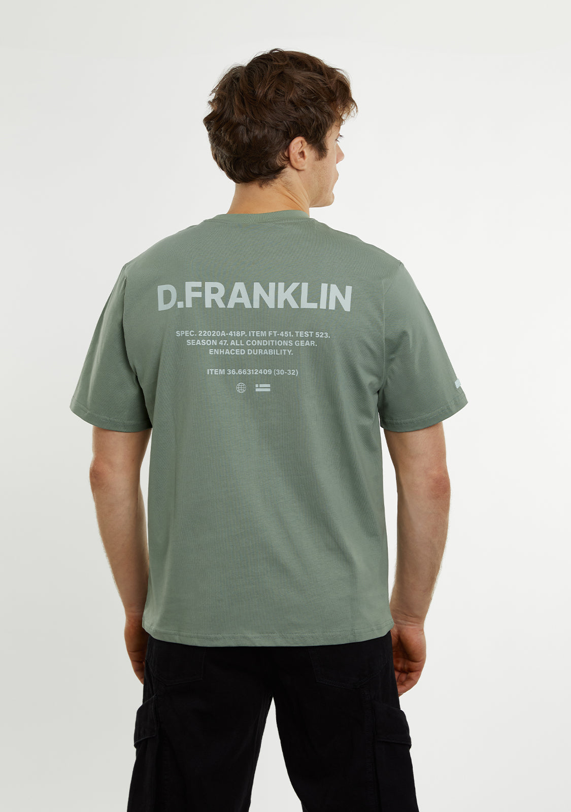 Esta t-shirt verde de mangas curtas com decote redondo apresenta o logo D.Franklin no lado superior esquerdo em contraste branco. Além disso, as costas têm um design exclusivo na mesma cor.